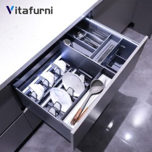 Vitafurni New Cabinet Kitchen Accessories Partitioned Dish Drawer Organizer Storage Aluminum Alloy Pull Out Basket with LED